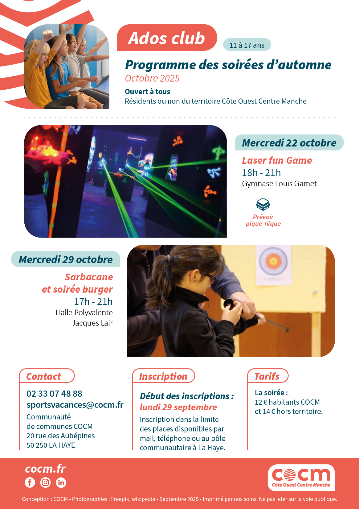 Dans le cadre du contexte sanitaire, les inscriptions se font de préférence par téléphone au 02.33.07.48.88 ou par mail à sfremond@cocm.fr auprès de Séverine FREMOND.