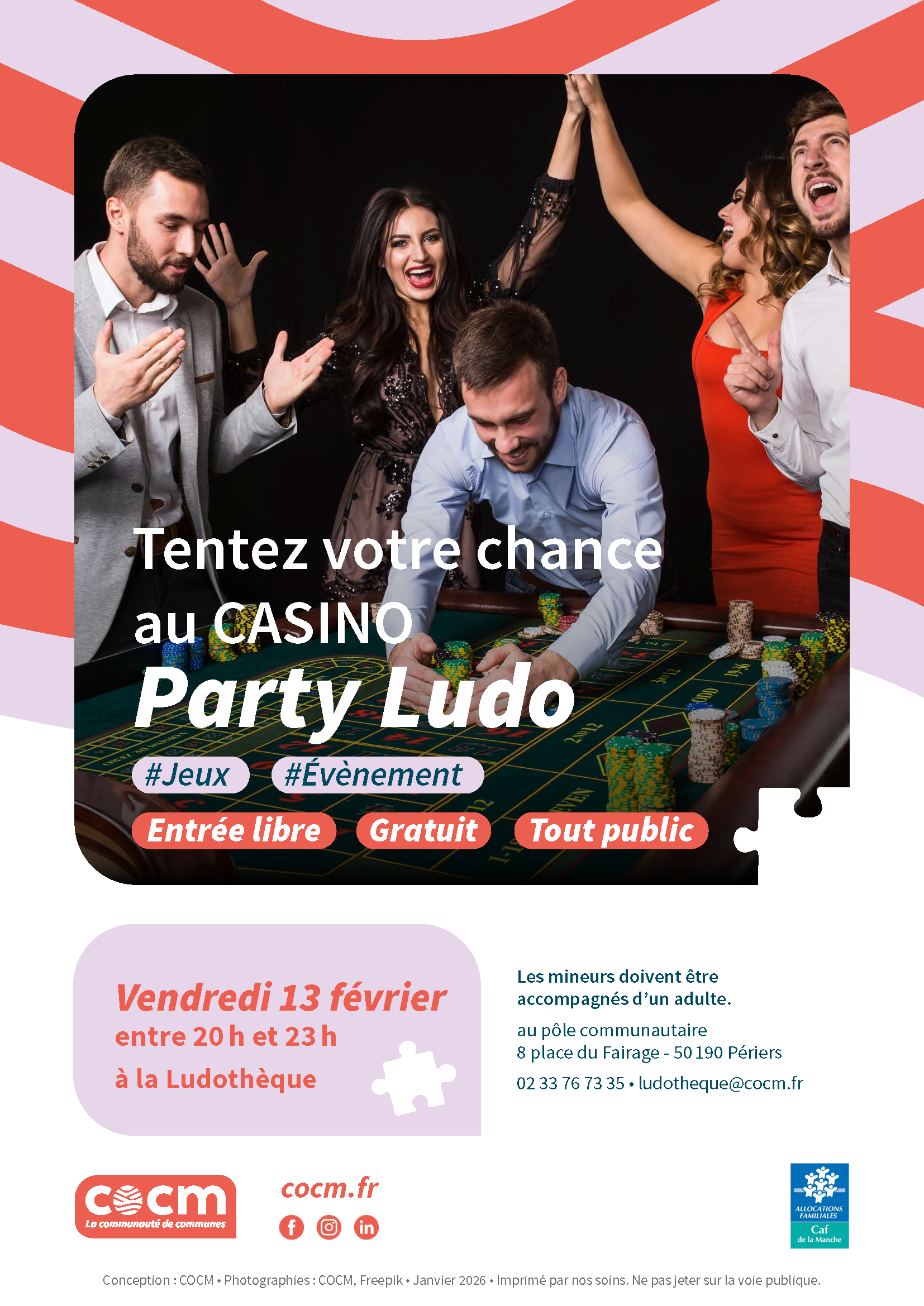 La ludothèque propose des Party Ludo : gratuites, ouvertes à tous (adhérents ou non, petits et grands), mensuelle (vendredi de 20h à 23h ou le samedi de 14h à 18h)