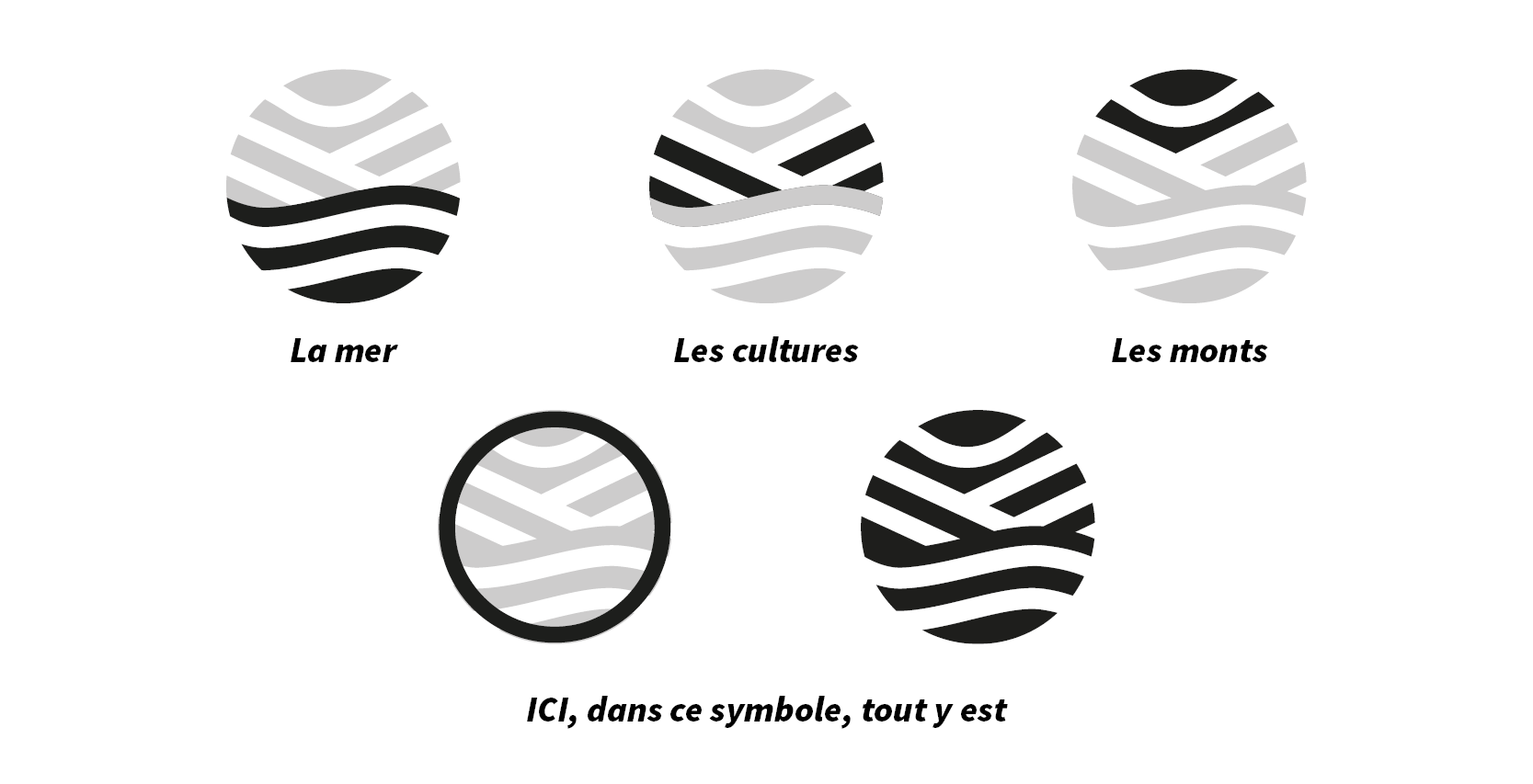 - Un symbole graphique englobé dans le « O » évoque des éléments emblématiques du territoire : littoral, cultures, monts. Cet idéogramme permet une reconnaissance immédiate de COCM.